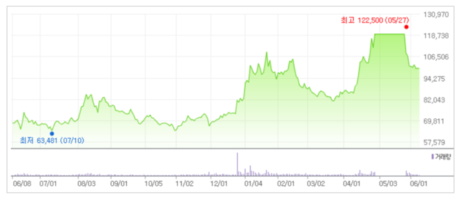 이같은 실적 개선 덕분에 LG 주가는 52주 신고가(5월 27일. 12만2500원)를 기록하기도 했다. 8일 현재 PER(주가수익비율)은 9.15배, PBR(주가순자산배수)은 0.91배이며 동일업종 평균 PER은 17.36배이다.