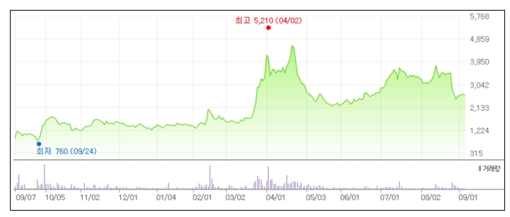 썸에이지의 최근 1년 주가 추이. [이미지=네이버 증권]