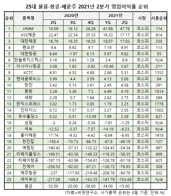 25대 항공 해운 물류주 2021년 2분기 영업이익률 순위. 단위 %.