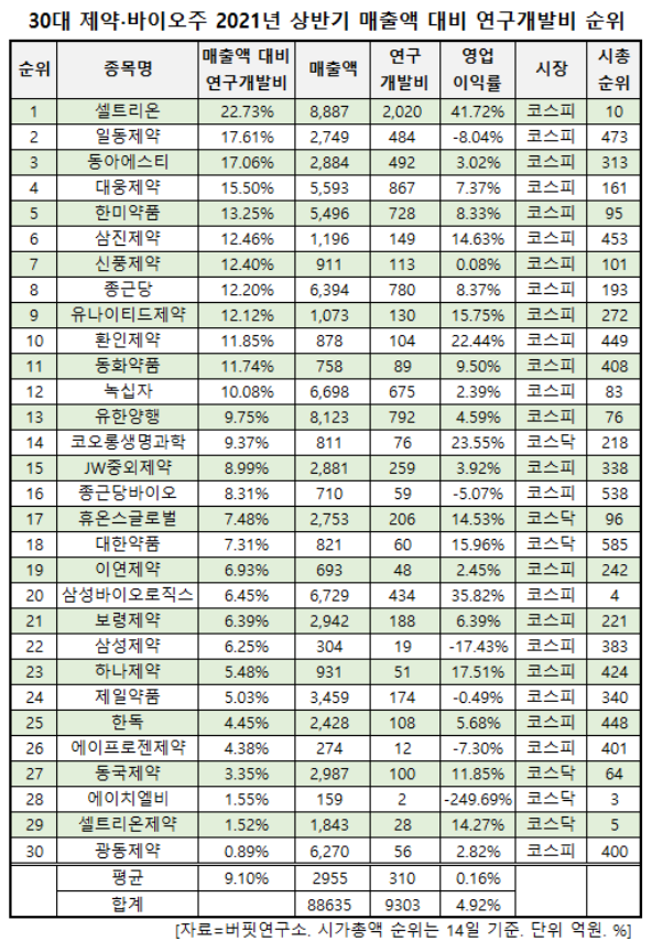 한국 주식 시장의 30대 제약∙바이오 기업 가운데 올해 상반기(1~6월) 매출액 대비 연구개발비 1위는 셀트리온(068270)(대표이사 기우성)으로 조사됐다. 30대 제약∙바이오 기업의 평균 매출액 대비 연구개발비는 9.10%였고, 연구개발비 총액은 9303억원이었다.