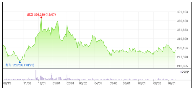셀트리온 최근 1년 주가 추이. [이미지=네이버 증권]