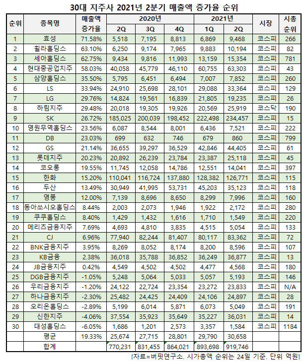한국 주식 시장의 30대 지주사 중 올해 2분기 매출액 증가율 1위는 효성(004800)(대표이사 조현준)으로 조사됐다.