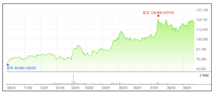 효성은 7월 15일 52주 신고가(12만8500원)를 기록했다. 효성의 24일 기준 PER(주가수익비율)은 16.72배, PBR(주가순자산배수)은 1.02배이며 동일업종 평균 PER은 11.66배이다.