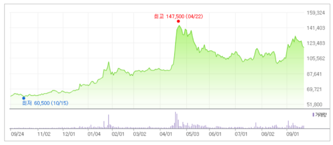효성 최근 1년 주가 추이. [이미지=네이버 증권]