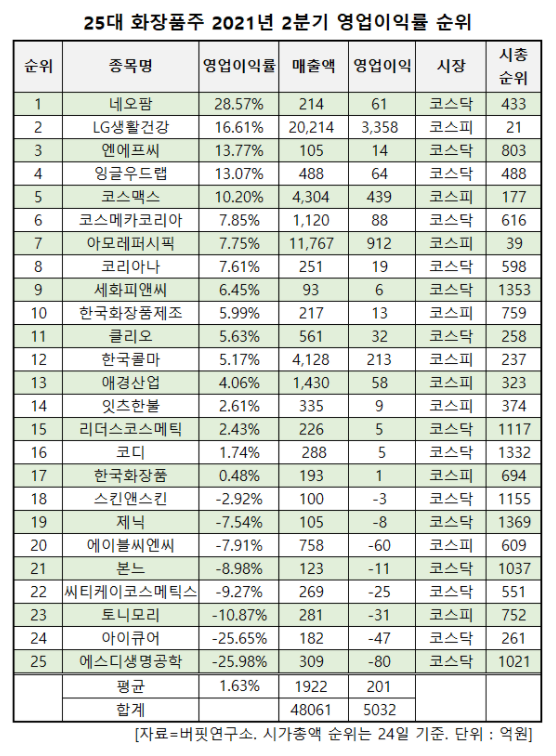 25대 화장품주 2021년 2분기 영업이익률 순위. [자료=버핏연구소]