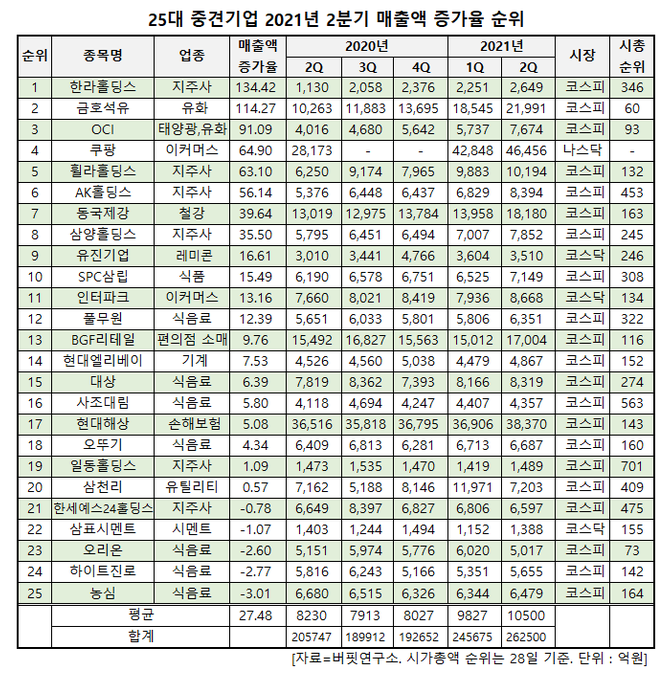 25대 중견기업 2021년 2분기 매출액 증가율 순위. 단위 억원. %. [자료=버핏연구소]