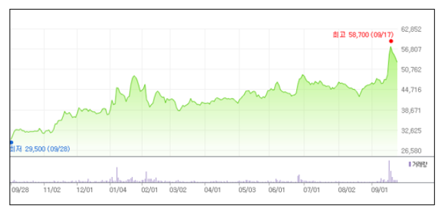 한라 홀딩스의 주가도 우상향 곡선을 그리고 있다. 지난해 9월 29일 최저가 2만9800원을 기점으로 상승 중이다. 대규모 투자가 발표된 이후인 지난 17일에는 신고가 5만8700원을 기록하기도 했다. 29일 기준 한라홀딩스의 PER(주가수익비율)은 4.65배, PBR(주가순자산배수)은 0.59배이며 동일업종 평균 PER은 14.90배이다.