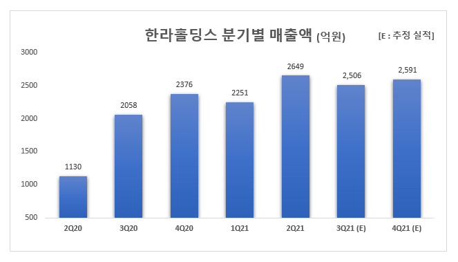 한라홀딩스는 지난해 2분기 매출액 1130억원을 기록했으나 지난해 하반기(3~4분기) 4434억원을 기록하며 분기별 매출액이 2000억대로 크게 뛰었다. 올해 1분기에도 매출액 2251억원을 달성했다. 올해 하반기에는 매출액 5000억원을 돌파할 것으로 예상된다.