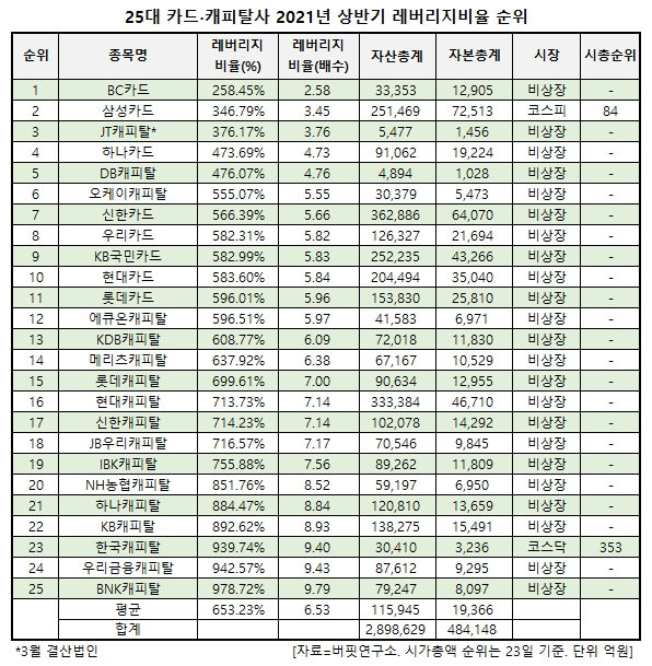 올해 2분기 기준 '25대 카드∙캐피탈사'의 평균 레버리지비율은 653.23%이고 평균 자산총계는 11조5945억원 평균 자본총계는 1조9366억원이다.
