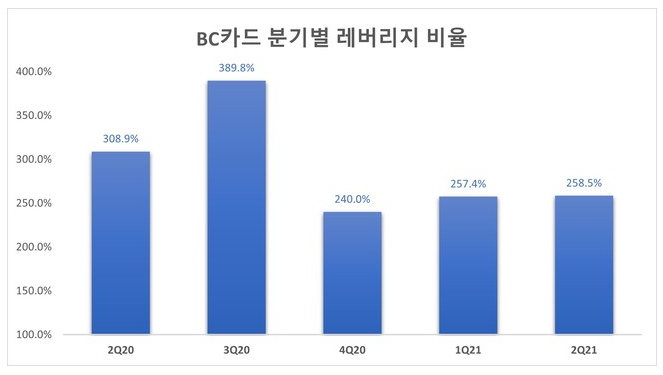 기업분석전문 버핏연구소 조사에 따르면 BC카드의 올해 상반기 레버리지비율은 258.45%로 1위를 기록했다. 이어 삼성카드(029780)(346.79%), JT캐피탈(376.17%), 하나카드(473.69%), DB캐피탈(476.07%) 순이다.