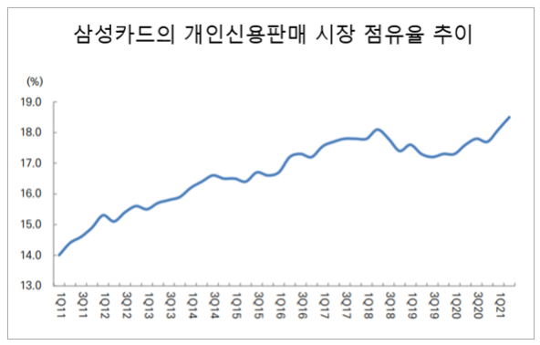 삼성카드의 레버리지 비율이 건전하다는 것은 그만큼 일반 소비자를 대상으로 대출 레버리지를 일으켜 실적을 개선할 수 있다는 의미를 갖고 있다. 올 들어 삼성카드의 개인신판 시장점유율은 증가세다. 1분기 18.1%, 2분기 18.5%로 증가한 데 이어 3분기에도 18.8%까지 늘어날 것으로 전망된다. 2019년 5월 코스트코 독점 계약이 종결 여파로 그 해 3분기 개인신판 점유율이 17.2%까지 빠졌었지만, 빠르게 저점을 찍고 이후로는 꾸준히 상승하고 있다. 삼성카드는 삼성그룹 계열 금융사이자 국내 유일의 카드상장사이다.