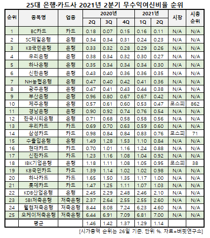 BC카드, 2Q 무수익여신비율 1위 '25대 은행∙카드사'...2위 SC제일은행