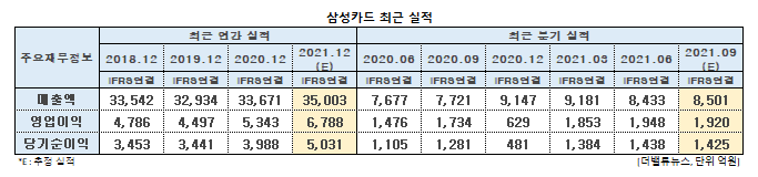'카드 빅4'(신한·삼성·현대·국민카드) 가운데는 삼성카드의 무수익여신비율이 가장 건전했다. 삼성카드는 국내 카드업계 유일 상장사이다. 26일 발표된 잠정실적에서 삼성카드의 올해 3분기 연결 기준 실적은 매출액 9403억원, 영업이익 1934억원, 당기순이익 1395억원을 기록했다. 매출액과 영업이익은 컨센서스(시장 기대치)를 상회하는 어닝 서프라이즈 달성했다. 삼성카드의 30일 이상 장기 연체율은 0.9%로 올 상반기 1.0%보다 내려가며 안정적인 수준을 유지했다.