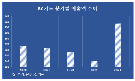 BC카드의 2분기 매출액과 영업이익은 각각 9068억원, 384억원으로 전년비 4.6%, 14% 증가했다. 이는 신용카드 매입액이 증가한 영향이 컸던 것으로 분석된다. 실제 BC카드는 신용카드 매입액이 1분기 52조원에서 2분기 55조원으로 늘었다. 아울러 금융사업 역시 1분기 52억원에서 2분기 81억원으로 개선됐다.