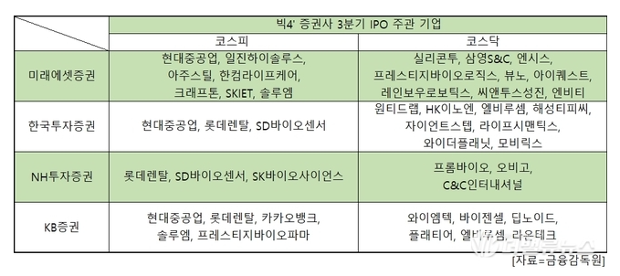 이번 IPO 실적 집계는 인수수수료를 기준으로 했다. 공모금액을 기준으로 할 경우 이른바 인기 위주의 'IPO대어'에 참여하는 증권사 실적이 높게 나올 수 있다는 리스크를 감안했다.