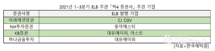 미래에셋증권은 멀티플렉스(영화관) 사업을 영위하는 CJ CGV(대표이사 허민회)의 CB 3000억원 발행의 대표주관 1건으로 올해 1~3분기 ELB 주관 1위를 기록했다. 인수수료 는 35억원이었다.