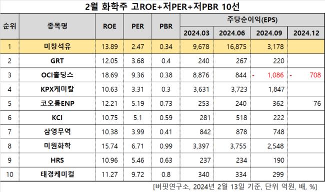 버핏연구소 조사 결과 미창석유는 2월 화학주 고ROE+저PER+저PBR 1위를 차지했으며, GRT(900290), OCI홀딩스(010060), KPX케미칼(025000)가 뒤를 이었다.