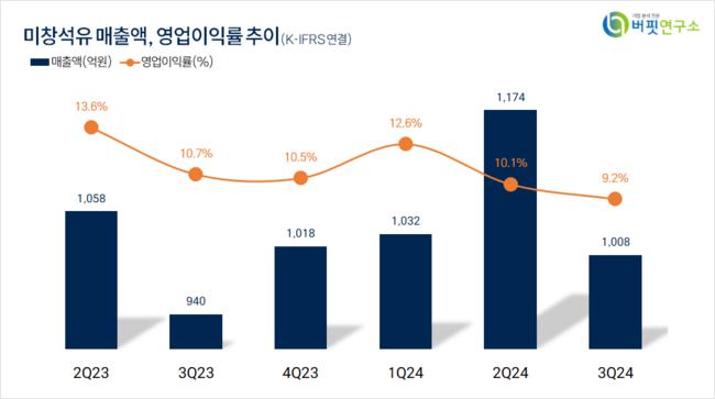 미창석유는 지난 3분기 매출액 1008억원, 영업이익 93억원을 기록하며 전년동기대비 매출액은 7.23% 증가, 영업이익은 7.92% 감소했다(K-IFRS 연결).