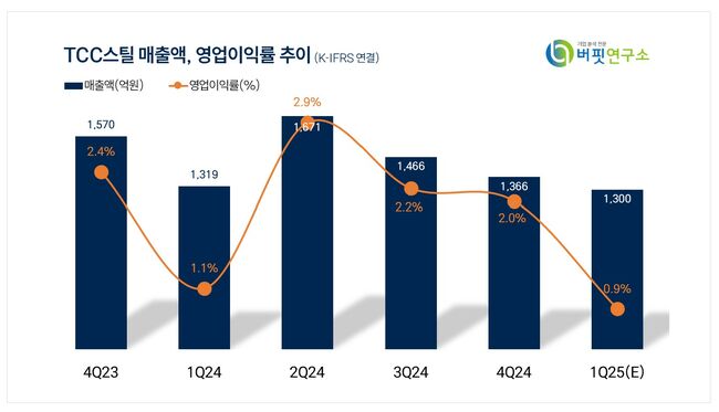 TCC스틸 최근 분기별 매출액 및 영업이익률 추이. [이미지= 버핏연구소]
