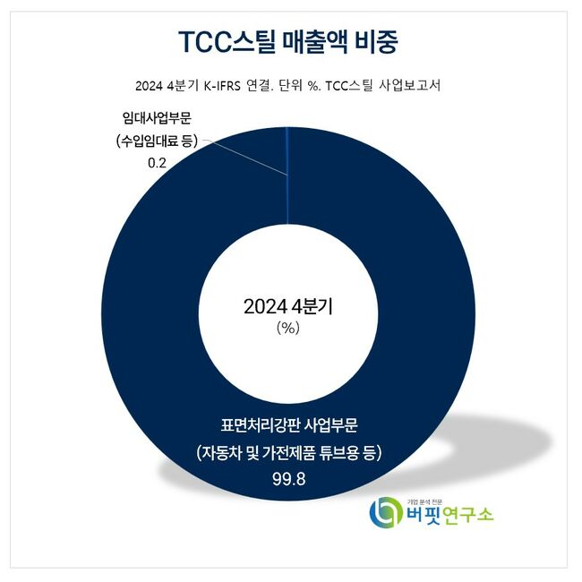 TCC스틸은 식음료 및 산업 포장용기와 전자제품에 쓰이는 주석도금강판·전해크롬산처리강판·니켈도금강판·동도금강판·수퍼틴·라미네이트강판 등을 생산하는 표면처리강판 전문제조업체다. 주 수요자는 제관업체, 왕관업체 등이 있으며, 국내 주석도금강판 시장은 국내 3개의 석도사가 공급하고 있는 시장구조로 영업 안전성이 높은 편이다. 매출에서 수출이 차지하는 비중은 60%로 동아시아 지역 및 미주지역 등 다양한 국가에 판매하고 있다.
