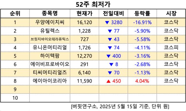 이어 유틸렉스(263050, 1228, ▼77원), 브릿지바이오테라퓨틱스(288330, 727, ▼43원), 유니온머티리얼(047400, 1726, ▼74원), 하이텍팜(106190, 12270, ▼400원), 에이비프로바이오(195990, 291, ▼8) 등 순이다.