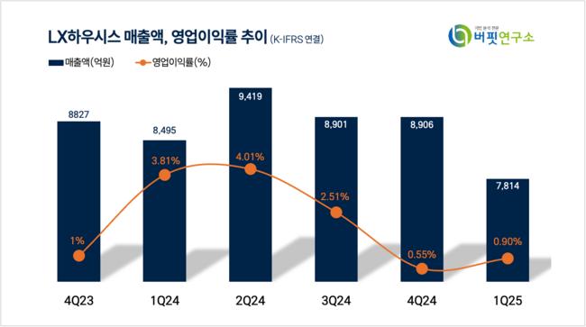 LX하우시스는 지난 1분기 매출액 7814억원(YoY -8.0%, QoQ -12.3%), 영업이익 71억원(YoY -78.2%, QoQ +43.8%)을 기록했다고 밝혔다.