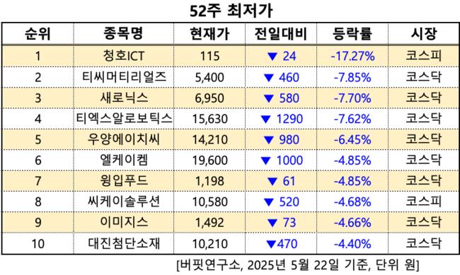 이어 티씨머티리얼즈(125020, 5400, ▼460원), 새로닉스(042600, 6950, ▼580원), 티엑스알로보틱스(484810, 15630, ▼1290원), 우양에이치씨(101970, 14210, ▼980원), 엘케이켐(489500, 19600, ▼1000) 등 순이다.