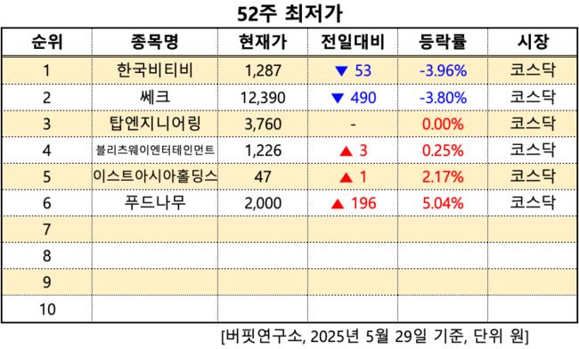 [52주 최저가] 한국비티비 전일비 3.96%↓…현재가 1287원