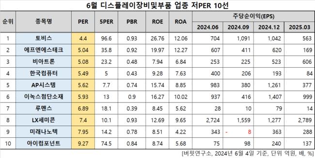 버핏연구소 조사 결과에 따르면 토비스가 6월 디스플레이장비및부품주 PER 4.4배로 가장 낮았다. 이어 에프엔에스테크(083500)(5.04), 비아트론(141000)(5.08), 한국컴퓨터(054040)(5.49)가 뒤를 이었다.