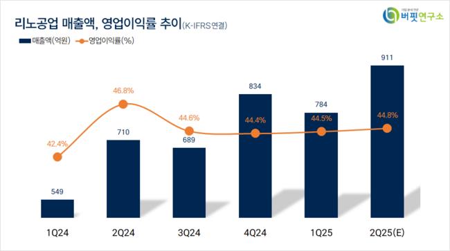 박상현 한국투자증권 애널리스트는 “2분기 매출액 911억원(전년동기대비 +29.3%), 영업이익 408억원(전년동기대비 +22.7%, 영업이익률 44.7%)으로 컨센서스를 7.4% 상회할 것으로 보인다”며 “세부 제품별로는 테스트 소켓 617억원(전년동기대비 +35%), 리노핀 206억원(전년동기대비 +15%)이 예상된다”고 전했다.