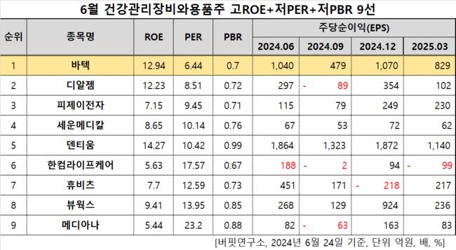 6월 건강관리장비와용품주 고ROE+저PER+저PBR 9선. [자료=한국거래소. 버핏연구소]