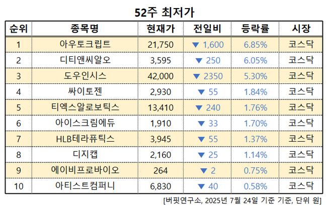 이어 디티앤씨알오(383930, 3595원, ▼ 250, 6.05%), 도우인시스(484120, 42000원, ▼ 2350, 5.3%), 싸이토젠(217330, 2930원, ▼ 55, 1.84%), 티엑스알로보틱스(484810, 13410원, ▼ 240, 1.76%), 아이스크림에듀(289010, 1910원, ▼ 33, 1.7%), HLB테라퓨틱스(115450, 3945원, ▼ 55, 1.37%), 디지캡(197140, 2160원 ▼ 25, 1.14%), 에이비프로바이오(195990, 264원, ▼ 2, 0.75%), 아티스트컴퍼니(321820, 6830원, ▼ 40, 0.58%) 순이다.