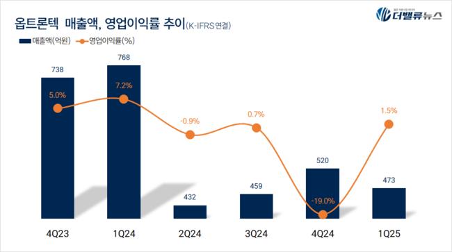 옵트론텍은 지난 1분기 매출액 473억원, 영업이익 7억원을 기록하며 전년동기대비 매출액은 38.41%, 영업이익은 87.27% 감소했다(K-IFRS 연결).