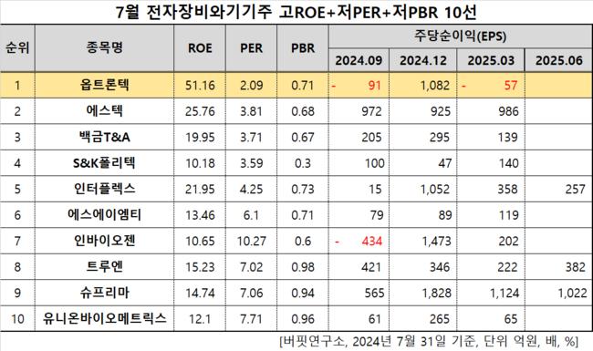 버핏연구소 조사 결과 옵트론텍이 7월 전자장비와기기주 고ROE+저PER+저PBR 1위를 차지했으며, 에스텍(069510), 백금T&A(046310), S&K폴리텍(091340)가 뒤를 이었다.