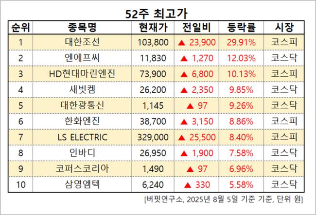 이어 엔에프씨(265740, 11830원, ▲ 1,270, 12.03%), HD현대마린엔진(071970, 73900원, ▲ 6,800, 10.13%), 새빗켐(107600, 26200원, ▲ 2,350, 9.85%), 대한광통신(010170, 1145원, ▲ 97, 9.26%), 한화엔진(082740, 38700원, ▲ 3,150, 8.86%), LS ELECTRIC(010120, 329000원, ▲ 25,500, 8.4%), 인바디(041830, 26950원 ▲ 1,900, 7.58%), 코퍼스코리아(322780, 1490원, ▲ 97, 6.96%), 삼영엠텍(054540, 6240원, ▲ 330, 5.58%) 순이다.