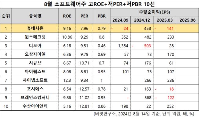 8월 소프트웨어주 고ROE+저PER+저PBR 10선. [자료=한국거래소. 버핏연구소]