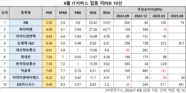 버핏연구소 조사 결과에 따르면 DB가 8월 IT서비스주 PER 2.55배로 가장 낮았다. 이어 싸이버원(356890)(4.06), 아이티센엔텍(010280)(4.63), 신세계 I&C(035510)(6.36)가 뒤를 이었다.