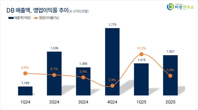 DB는 지난 2분기 매출액 1501억원, 영업이익 88억원을 기록하며 전년대비 매출액은 2.28%, 영업이익은 6.38% 감소했다(K-IFRS 연결).
