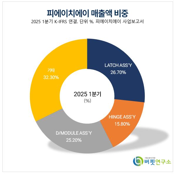 피에이치에이는 DOOR MODULE, LATCH, HINGE, STRIKER 등 5개 제품군을 생산해 현대, 기아, 르노코리아 등 국내 완성차와 GM, PSA 등 해외 업체에 납품하고 있다. 최근 400여 건의 특허 출원과 ISO 인증을 통해 기술력과 품질 경쟁력을 확보하고 있다.