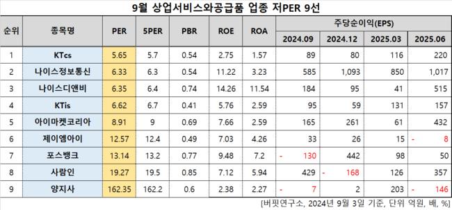 9월 상업서비스와공급품주 저PER 9선. [자료=버핏연구소]