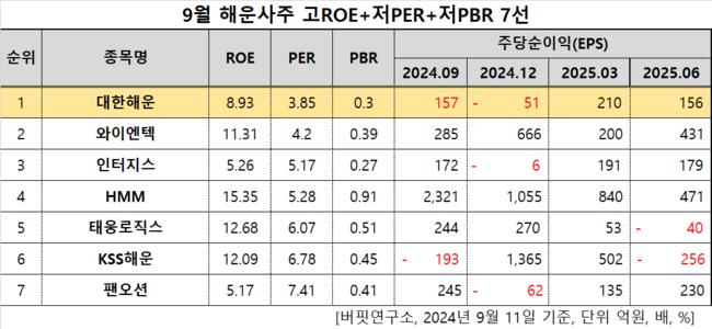 9월 해운사주 고ROE+저PER+저PBR 7선. [자료=한국거래소. 버핏연구소]