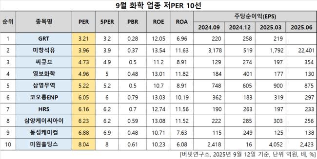 9월 화학주 저PER 10선. [자료=버핏연구소]