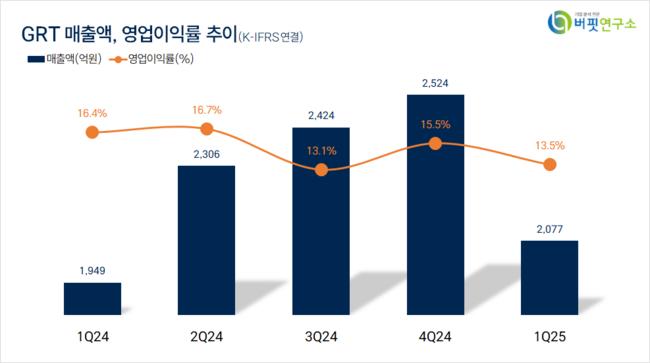 GRT는 지난 1분기 매출액 2077억원, 영업이익 281억원을 기록하며 전년대비 매출액은 6.57% 증가, 영업이익은 12.19% 감소했다(K-IFRS 연결).