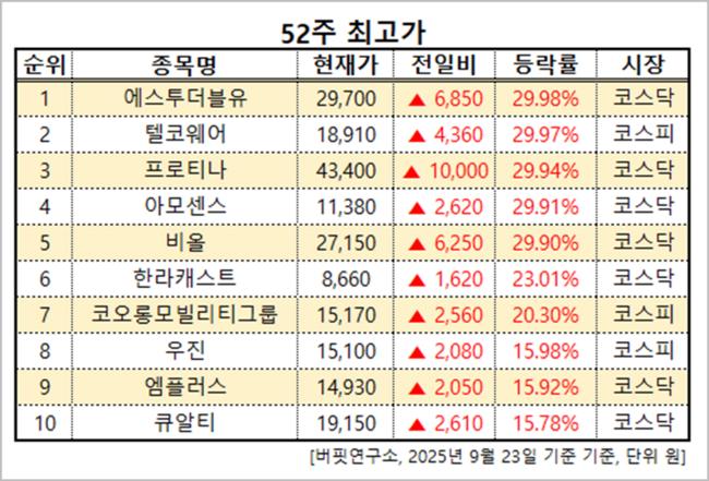 이어 텔코웨어(078000, 18910원, ▲ 4,360, 29.97%), 프로티나(468530, 43400원, ▲ 10,000, 29.94%), 아모센스(357580, 11380원, ▲ 2,620, 29.91%), 비올(335890, 27150원, ▲ 6,250, 29.9%), 한라캐스트(125490, 8660원, ▲ 1,620, 23.01%), 코오롱모빌리티그룹(450140, 15170원, ▲ 2,560, 20.3%), 우진(105840, 15100원 ▲ 2,080, 15.98%), 엠플러스(259630, 14930원, ▲ 2,050, 15.92%), 큐알티(405100, 19150원, ▲ 2,610, 15.78%) 순이다.