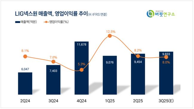 이지호 메리츠증권 애널리스트는 LIG넥스원이 3분기 매출액 9631억원, 영업이익 757억원을 기록하며 시장추정치에 부합할 것이라고 전망했다. 국내사업 매출 규모의 확대와 기존 수익성은 유지될 것으로 예상했으나, 상반기 대비 증가한 개발비 반영으로 인해 전분기대비 영업이익의 하락은 불가피할 것이라고 전했다.