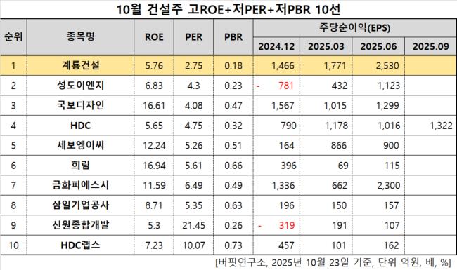 버핏연구소 조사 결과 계룡건설이 10월 건설주 고ROE+저PER+저PBR 1위를 차지했으며, 성도이엔지(037350), 국보디자인(066620), HDC(012630)가 뒤를 이었다.
