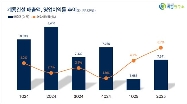 계룡건설은 지난 2분기 매출액 7341억원, 영업이익 490억원으로 전년동기대비 매출액은 13.29% 감소, 영업이익은 112.12% 증가했다(K-IFRS 연결).