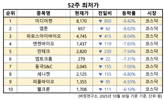 이어 앱튼(270520, 657원, ▼ 62, -8.62%), 파로스아이바이오(388870, 4745원, ▼ 415, -8.04%), 엔젠바이오(354200, 1437원, ▼ 119, -7.65%), 민테크(452200, 2820원, ▼ 230, -7.54%), 앱토크롬(109960, 279원, ▼ 22, -7.31%), 동국S&C(100130, 2045원, ▼ 155, -7.05%), 세니젠(188260, 2125원 ▼ 155, -6.8%), 피플바이오(304840, 1355원, ▼ 95, -6.55%), 웰크론(065950, 1708원, ▼ 111, -6.1%) 순이다.