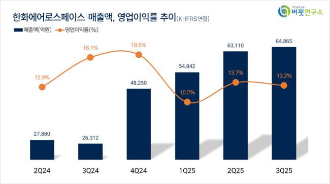 배성조 한화투자증권 애널리스트는 “3분기 매출액 6조4865억원(전년동기대비 +146.5%), 영업이익 8564억원(전년동기대비 +79.5%, 영업이익률 13.2%)으로 영업이익이 컨센서스에 부합했다”며 “지상방산 부문은 국내 매출 비중이 전분기대비 4% 증가했음에도 27.1%의 양호한 영업이익률을 기록했고 반복 제작을 통한 생산성 개선이 매분기 확인되고 있다”고 전했다.