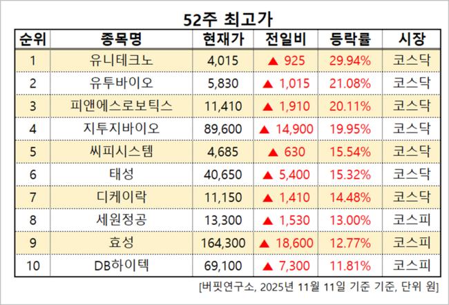 이어 유투바이오(221800, 5830원, ▲ 1015, 21.08%), 피앤에스로보틱스(460940, 11410원, ▲ 1910, 20.11%), 지투지바이오(456160, 89600원, ▲ 14900, 19.95%), 씨피시스템(413630, 4685원, ▲ 630, 15.54%), 태성(323280, 40650원, ▲ 5400, 15.32%), 디케이락(105740, 11150원, ▲ 1410, 14.48%), 세원정공(021820, 13300원, ▲ 1530, 13.00%), 효성(004800, 164300원, ▲ 18600, 12.77%), DB하이텍(000990, 69100원, ▲ 7300, 11.81%) 순이다.